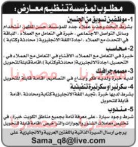 - مطلوب للعمل بمؤسسة تنظيم معرض الوظائف الاتية و هى موظفين